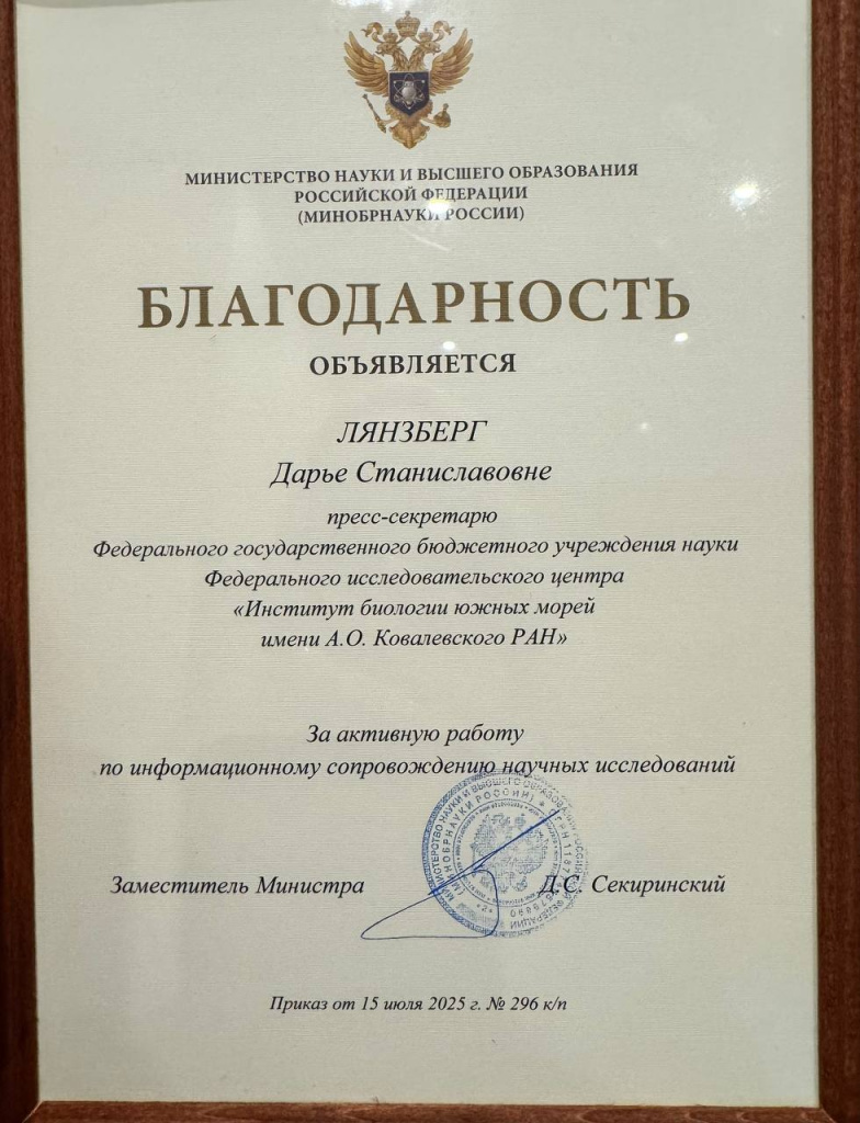 Так, за активную работу по информационному сопровождению научных исследований Благодарность Министерства науки и высшего образования РФ была вручена пресс-секретарю Института биологии южных морей имени А.О. Ковалевского РАН Дарье Лянзберг. Пресс-службу ФИЦ ИнБЮМ в Минобрнауки отмечают уже второй год подряд. В 2024-м за достижения в популяризации научных знаний она получила Благодарность Заместителя министра К.И. Могилевского.