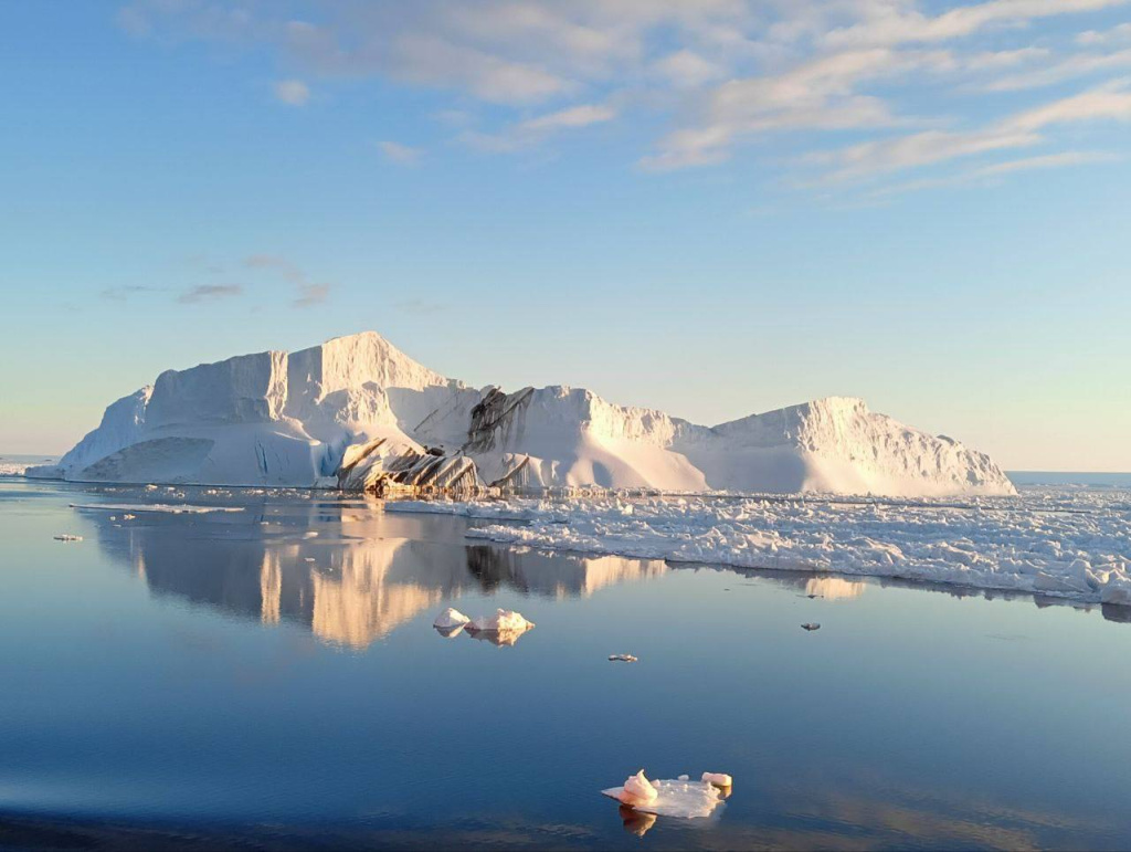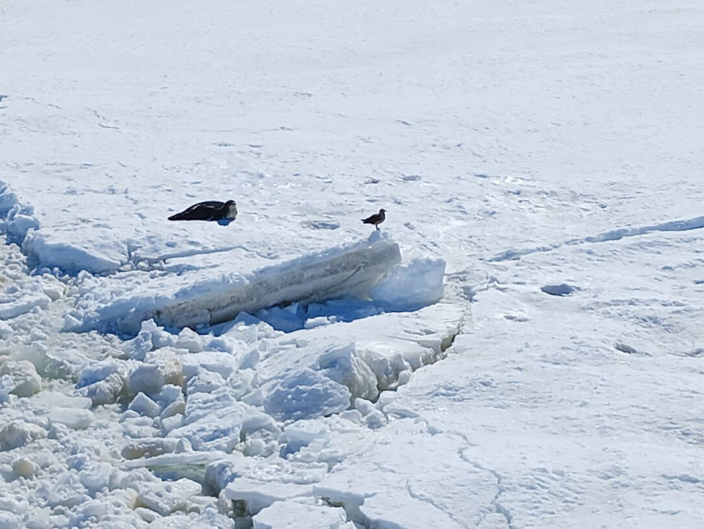 «При приближении к материку ледоколу «Академик Федоров» пришлось разламывать лед. По пути следования нас провожали любопытными взглядами пингвины и тюлени, в отдалении пускали свои фонтаны киты. Навстречу нам из Антарктиды шел китайский ледокол. Сейчас наше судно стоит во льдах недалеко от берега. С нами по соседству, но на безопасном расстоянии, находится вмерзший в лед айсберг.