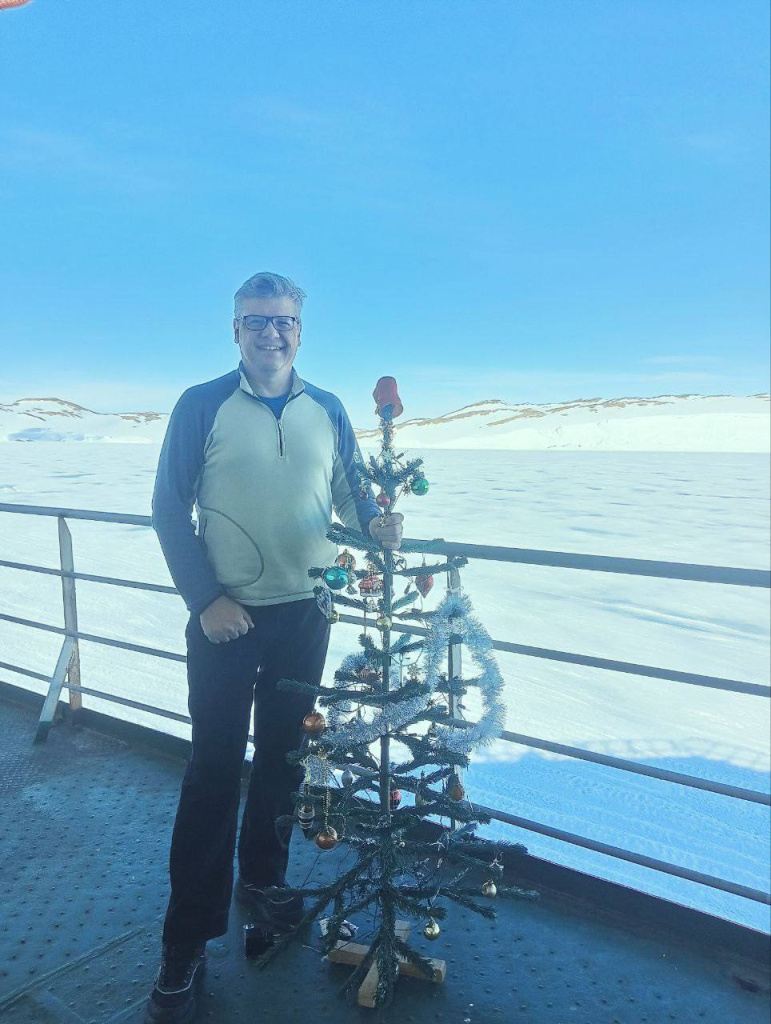 Сейчас мы готовимся к встрече Нового года. На этот раз мы будем встречать праздник у берегов Антарктиды возле российской станции «Мирный». На судне наряжают искусственные ели, пекут вкусное имбирное печенье и готовят новогоднюю развлекательную программу с разными конкурсами. Если после прохождения экватора на костюмированном празднике мы встречались с хозяином морей – Нептуном, то сейчас ждем нового гостя – Деда Мороза.